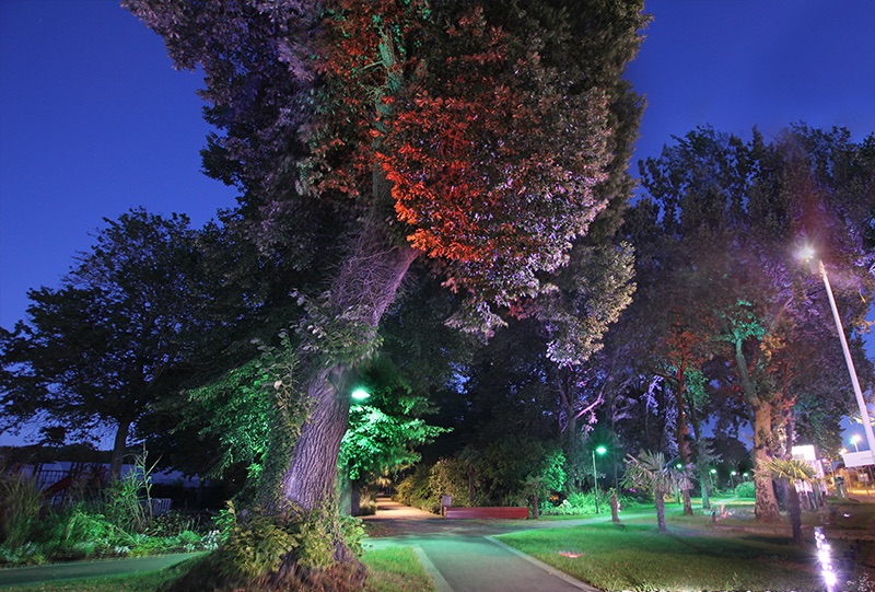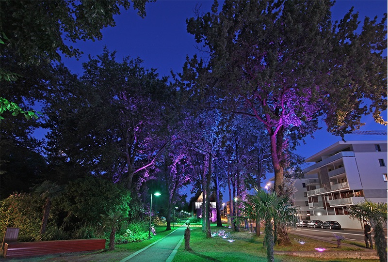 L’objectif est en outre d’éviter les trous noirs créés par la végétation massive, et offrir une ambiance plus agréable et propice à la déambulation. Enfin, les arbres sont éclairés sur plusieurs plans pour donner du volume au paysage. Ils créent alors un cadre autour de la Maison de l’Environnement déjà illuminée.